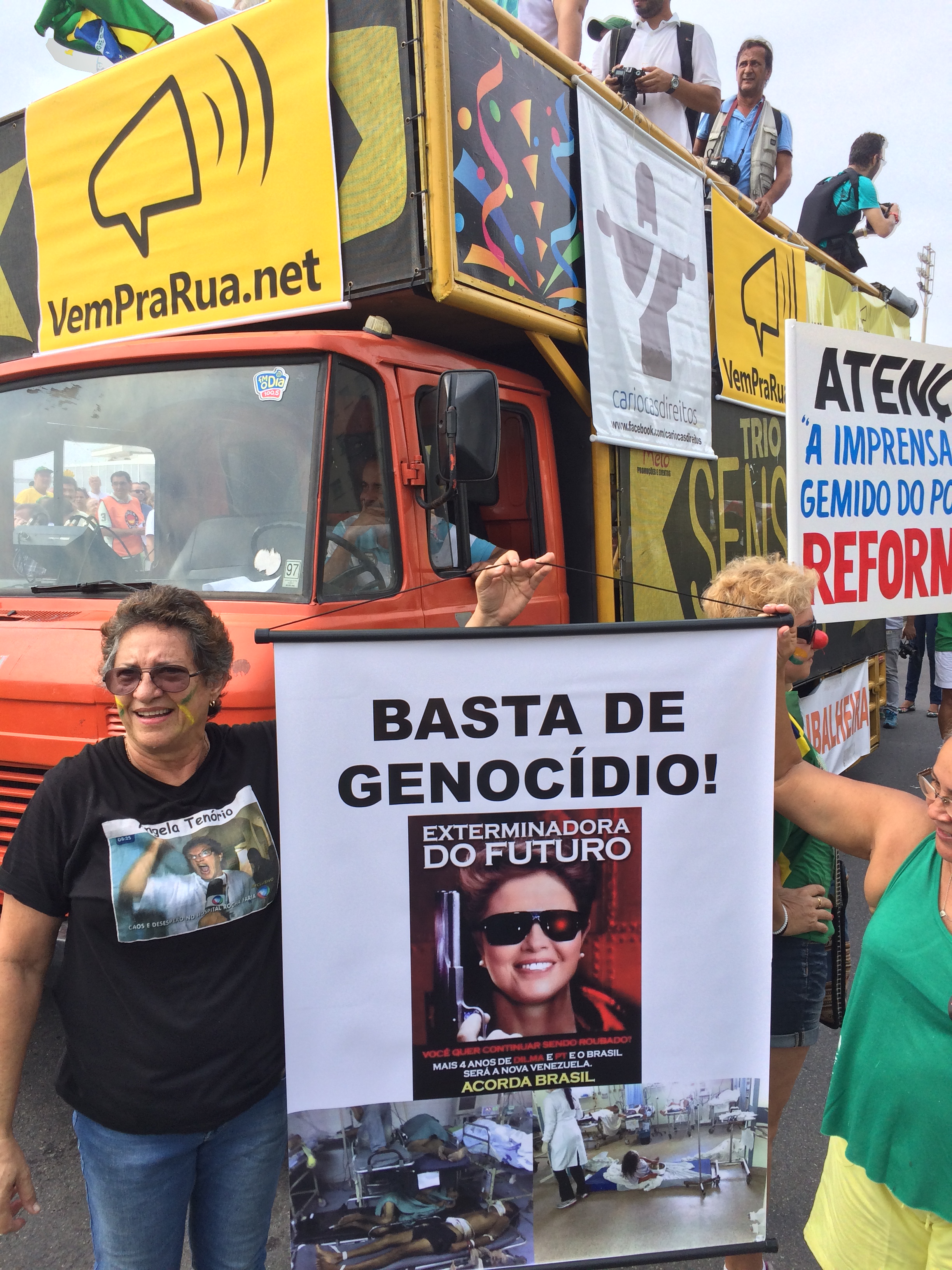 Centenas de pessoas se reúnem na altura do Posto 5 da Avenida Atlântica para protestar contra o governo de Dilma Rousseff. A maioria dos manifestantes que se concentram para o ato vestem roupas com as cores verde e amarela. Muitos estão com os rostos pintados com os tons da bandeira do Brasil. Outros estão com adesivo de “Fora, Dilma”, narizes de palhaço e com apitos. Nos cartazes, há pedidos pelo fim da corrupção e pela reforma política. Nos prédios da Avenida Atlântica, é possível ver bandeiras do Brasil, colocadas pelos moradores.