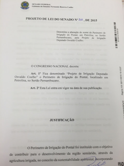O Senador Fernando Bezerra apresentou Projeto de Lei denominando o Perímetro de Irrigação do Pontal para Projeto de Irrigação Deputado Osvaldo Coelho.