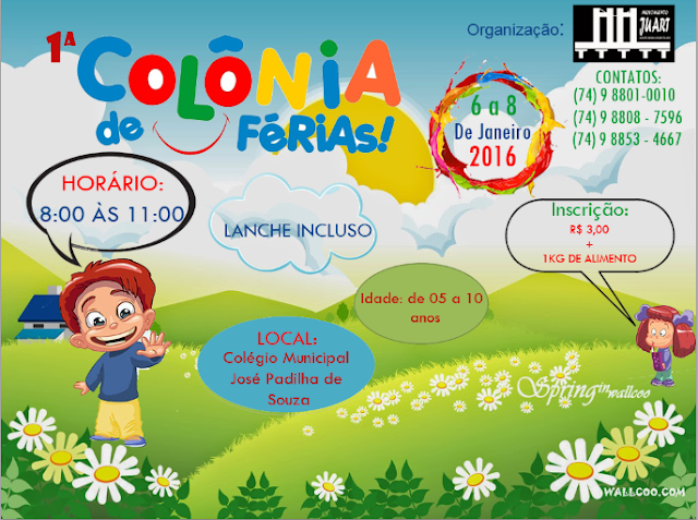 Depois de um ano com bons frutos no Alto do Cruzeiro, juntamos parcerias e formamos a 1ª colônia de férias solidária. A programação vai do dia 6 até o dia 8 com vários cursos como teatro, origami, desenho e muito mais. O grupo está pedindo uma taxa de 3 reais + 1KG de alimento não perecível para a inscrição que está sendo feita na escola todos os dias.