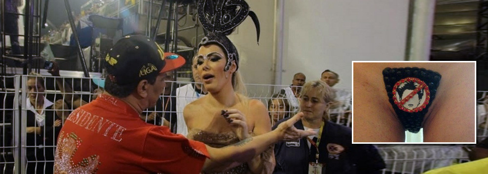 A agremiação a obrigou a sair vestida com um comportado macacão cor da pele pelo Anhembi. Na metade do desfile, a modelo apareceu se despindo do macacão em pleno desfile, jogando parte da fantasia no chão e deixando os seios à mostra. Na sequência, foi rapidamente retirada da avenida pelo presidente da Liga das Escolas de Samba, Paulo Sergio Ferreira, o Serginho.