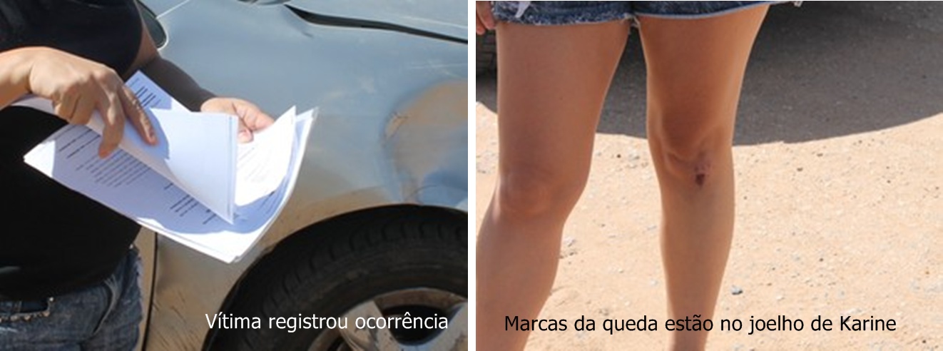 O crime aconteceu por volta das 20h enquanto ela ia na casa da mãe. Os bandidos levaram o seu carro com a bolsa, os documentos pessoais e celulares. Ao correr, Karine caiu no chão e as marcas da queda ficaram pelo corpo. “Morei há mais de 30 anos em São Paulo e nunca passei por uma situação dessa. É uma coisa assustadora, porque as coisas aqui estão violentas. As pessoas aqui são muito violentas. Meu filho está muito assustado e não quer nem ir para a escola”, disse Karine.