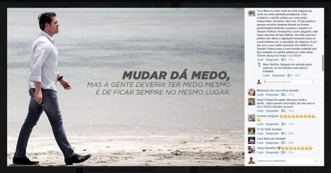 Quando elogiado pelo diretor da Defesa Civil de Santana do Ipanema, Tuca Maia, e exaltado como alternativa a senadores que “envergonham o povo alagoano”, Marx Beltrão agradeceu e disse se sentir incentivado mais ainda a trabalhar, em resposta ao comentário da publicação, no Facebook.