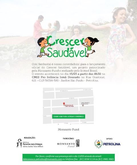 Os estudantes da Rede Municipal de Petrolina vão ser contemplados com as atividades do programa ‘Crescer Saudável’, uma ação Inmed Brasil, em parceria com a Fundação Monsanto. O lançamento acontecerá nesta quarta-feira (15), às 8h30, no Centro Municipal de Educação Infantil (CMEI) Pró-Infância Irmã Dourado, Jardim São Paulo, Petrolina (PE).