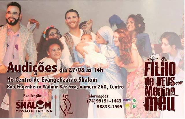 A Comunidade Católica Shalom, Missão Petrolina (PE), vem convidar a todos, que tenham talentos, desejem e gostem de encenar, para participarem das audições, abertas a todo o público, independente da idade, para o espetáculo “Filho de Deus Menino Meu”, que será encenado no final do ano em várias partes da cidade de Petrolina e municípios circunvizinhos com apresentação principal marcada para a noite do Natal na Concha Acústica.