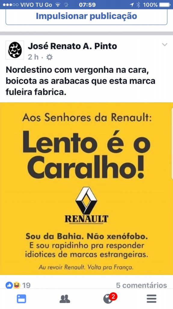 O vídeo também acaba com essa cena. No final de ambas as peças aparece a frase “viajar quebra preconceitos”. Um internauta chegou a sugerir boicote à montadora e direcionou o post aos empresários da Renault: ‘Lento é o caralh*! Sou da bahia. Não xenófobo. E sou rapidinho pra responder idiotices de marcas estrangeiras. Au revori Renault. Volta pra França”.