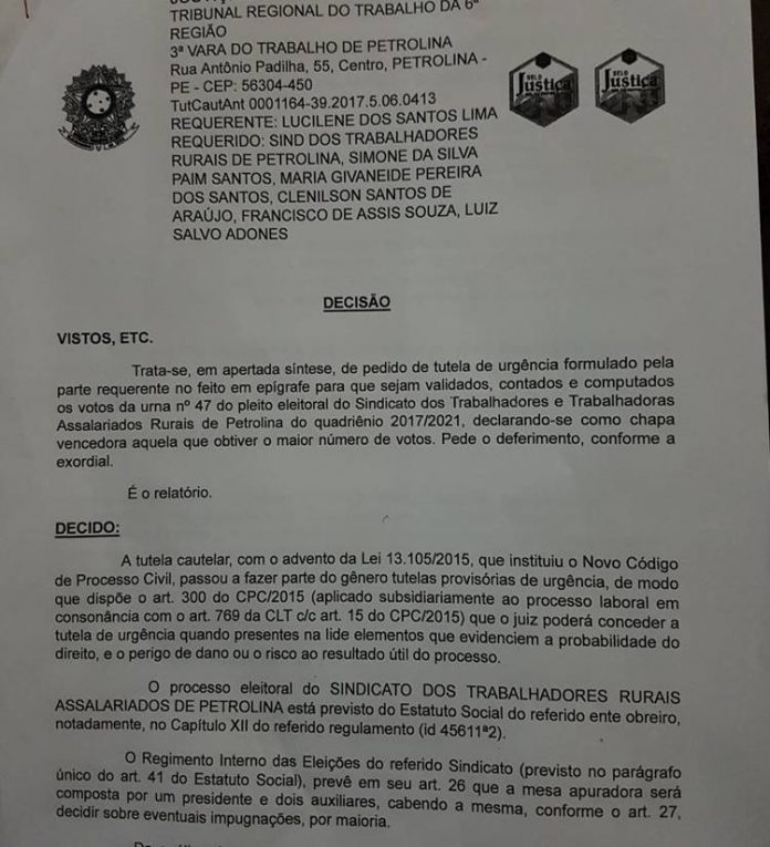 A eleição para a presidência do Sindicato dos Trabalhadores e Trabalhadoras Assalariados Rurais (STTAR) que foi realizada no último dia 21 de novembro de 2017, se transforma em uma novela que poderá ter resultados nada positivos para os dois lados. O juiz titular da Vara do Trabalho, George Sidney, em uma decisão cheia de questionamentos, acatou uma ação solicitada pela Chapa 1, encabeçada pela candidata Leninha, que perdeu a eleição para Simone Paim, candidata a presidente pela Chapa 2 , por 16 votos de diferença.