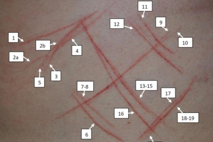 “Pode-se concluir que as lesões tenham sido produzidas cautelosamente, de modo a não causarem dano às camadas profundas da derme, provocando alterações que são apenas superficiais. Não seria esperado produzirem-se lesões como estas, com as características das que foram evidenciadas neste exame de corpo de delito, por 1 agressor que agisse de forma tempestuosa e demasiadamente rápida, como se esperaria que fosse o caso em situações de agressões furtivas e em ambientes adversos”, diz trecho do laudo.