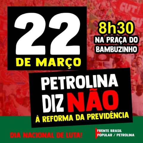 A organização do evento é da Frente Brasil Popular em Petrolina, que pretende chamar a atenção da sociedade para o projeto nocivo da reforma da previdência, como forma de cobrar dos parlamentares federais da nossa região, uma posição contra o projeto do governo que retira direitos de trabalhadores e trabalhadoras. Nenhum direitos a menos!