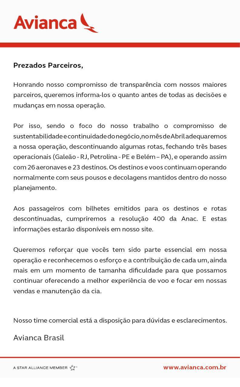 Em nota enviada aos parceiros, a Avianca informa que está honrando o compromisso de transparência com “nossos maiores parceiros” ao informar sobre decisões e mudanças em suas operações, como podemos ver na íntegra a nota abaixo.