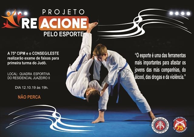 No dia 12.10.19, às 19h, o Major Roberto, Comandante da 75ªCIPM, o senhor Hernani, Presidente do Conseg/Leste e o Professor Paulo Afonso, promoverão o exame de faixas do Judô do Projeto Reacione Pelo Esporte na Quadra do Residencial Juazeiro II, bairro Itaberaba – BA.