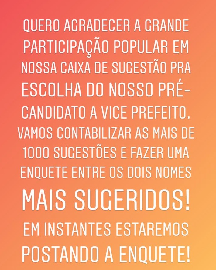 Sobre o nome que foi escolhido para ser o pré-candidato a vice-prefeito, Gustavo Caribe (MDB) disse que ainda está com sua equipe terminando o levantamento feito em seu instagram.