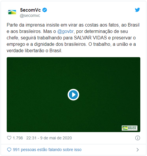 “Parte da imprensa insiste em virar as costas aos fatos, ao Brasil e aos brasileiros. Mas o @govbr, por determinação de seu chefe, seguirá trabalhando para salvar vidas e preservar o emprego e a dignidade dos brasileiros. O trabalho, a união e a verdade libertarão o Brasil”, diz a publicação.