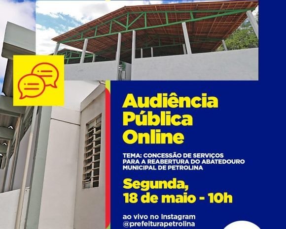 Acontecerá na próxima segunda-feira (18), a partir das 10h, uma audiência pública online para discutir vários aspectos sobre a reabertura do abatedouro de Petrolina. Por conta da pandemia do novo Coronavírus, a transmissão será feita, exclusivamente, pelo perfil oficial da prefeitura (@prefeiturapetrolina) no Instagram.