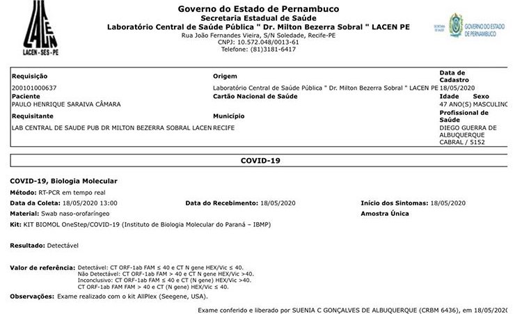 Depois de anunciar, na noite de ontem, que teria testado positivo para a Covid-19, o governador Paulo Câmara (PSB) publicou em suas redes sociais uma imagem do exame realizado. Confira!