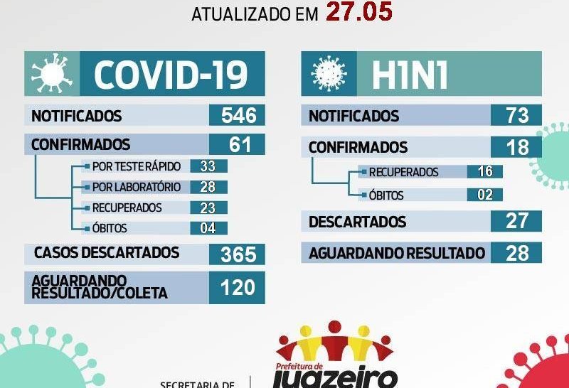 Para o novo coronavírus, Juazeiro tem notificado 546 casos sendo que 365 já tiveram os exames descartados por testarem negativo para a doença. Outras 120 pessoas estão aguardando resultado ou para fazer a coleta. Dos 61 casos confirmados, 35 são do sexo feminino e 26 do sexo masculino e, desse total, 26 são profissionais de saúde. O município tem ainda a confirmação de quatro óbitos.