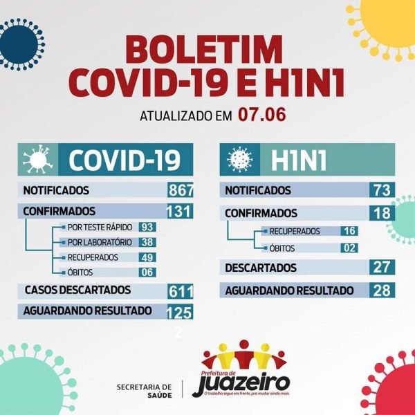 Para o novo coronavírus, Juazeiro tem 867 notificações sendo que 611 exames já foram descartados por testarem negativo para a doença e outros 125 estão aguardando resultado ou coleta. Juazeiro tem ainda a recuperação de 49 pacientes, ou seja, estão clinicamente curados. Dos 131 casos confirmados, 60 são do sexo feminino, 71 do sexo masculino e deste quantitativo total, 40 são profissionais de saúde.