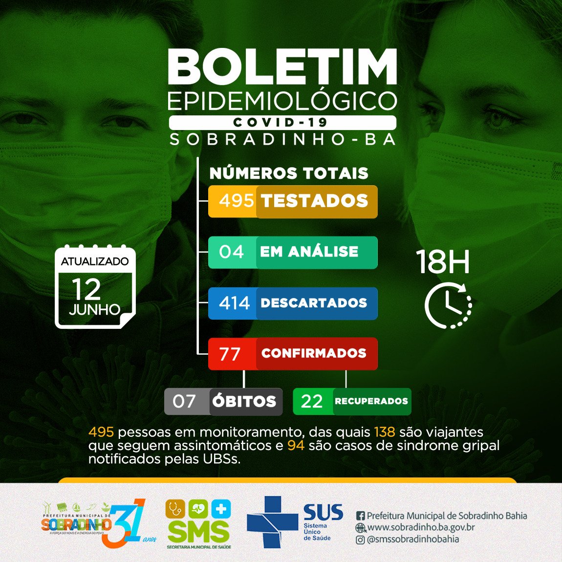 Em Boletim Epidemiológico divulgado nesta sexta-feira (12), a Prefeitura de Sobradinho, através da Secretaria de Saúde, informa a confirmação de quatro casos do novo coronavírus e 22 curas clínicas. Até o momento o município registra 77 casos da infecção, com 7 óbitos.