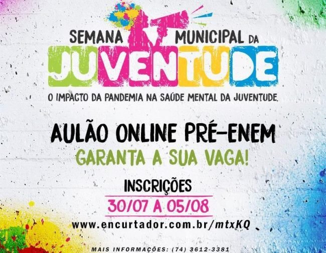 Com o tema ‘O impacto da pandemia na saúde mental da juventude’, este ano a Semana da Juventude será realizada de 10 e 14 de agosto, com uma programação que inclui Bate Papos Online, abordando vários temas e o Aulão Pré-Enem.