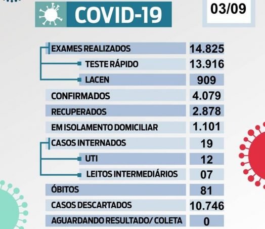 O município já realizou 14.825 testes com 10.746 resultados negativos, sendo considerados descartados. Dos 4.079 casos, 2.222 são do sexo feminino, 1.859 do sexo masculino e, destes, 251 são profissionais da saúde. Em isolamento estão 1.101 pessoas e 19 internadas, sendo 12 em UTI e 07 em leitos intermediários.