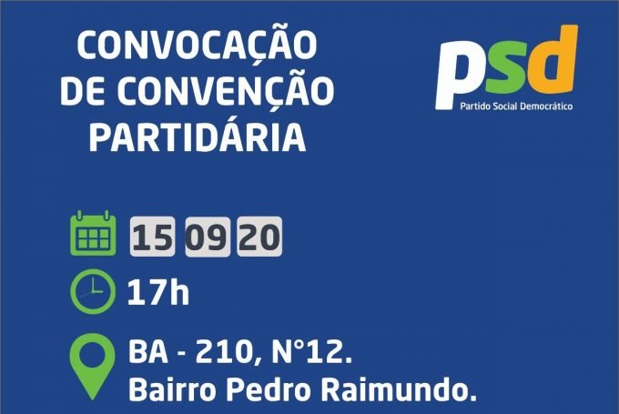 O Partido Social Democrático (PSD) de Juazeiro, convida seus convencionais, para participar da convenção para as eleições municipais de 2020. O evento terá início às 17h no espaço localizado na BA-210, N° 12, próximo ao bairro Pedro Raimundo.