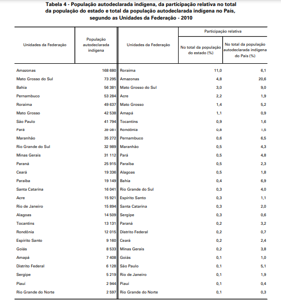 Em números gerais, de acordo com o último censo do IBGE, em 2010, vivem na Bahia 56.381 indivíduos, representando 16 grupos étnicos, o que totaliza 6,9% da população indígena brasileira. Já em Santa Catarina, também segundo o IBGE, são 16.041 índios, que correspondem a 2% da população nacional. Enquanto a Bahia é a terceira no ranking, neste quesito os catarinenses aparecem na modesta 15ª posição. Contudo, nos investimentos, as posições se invertem. Santa Catarina aparece em quinto, enquanto a Bahia é a sexta colocada.