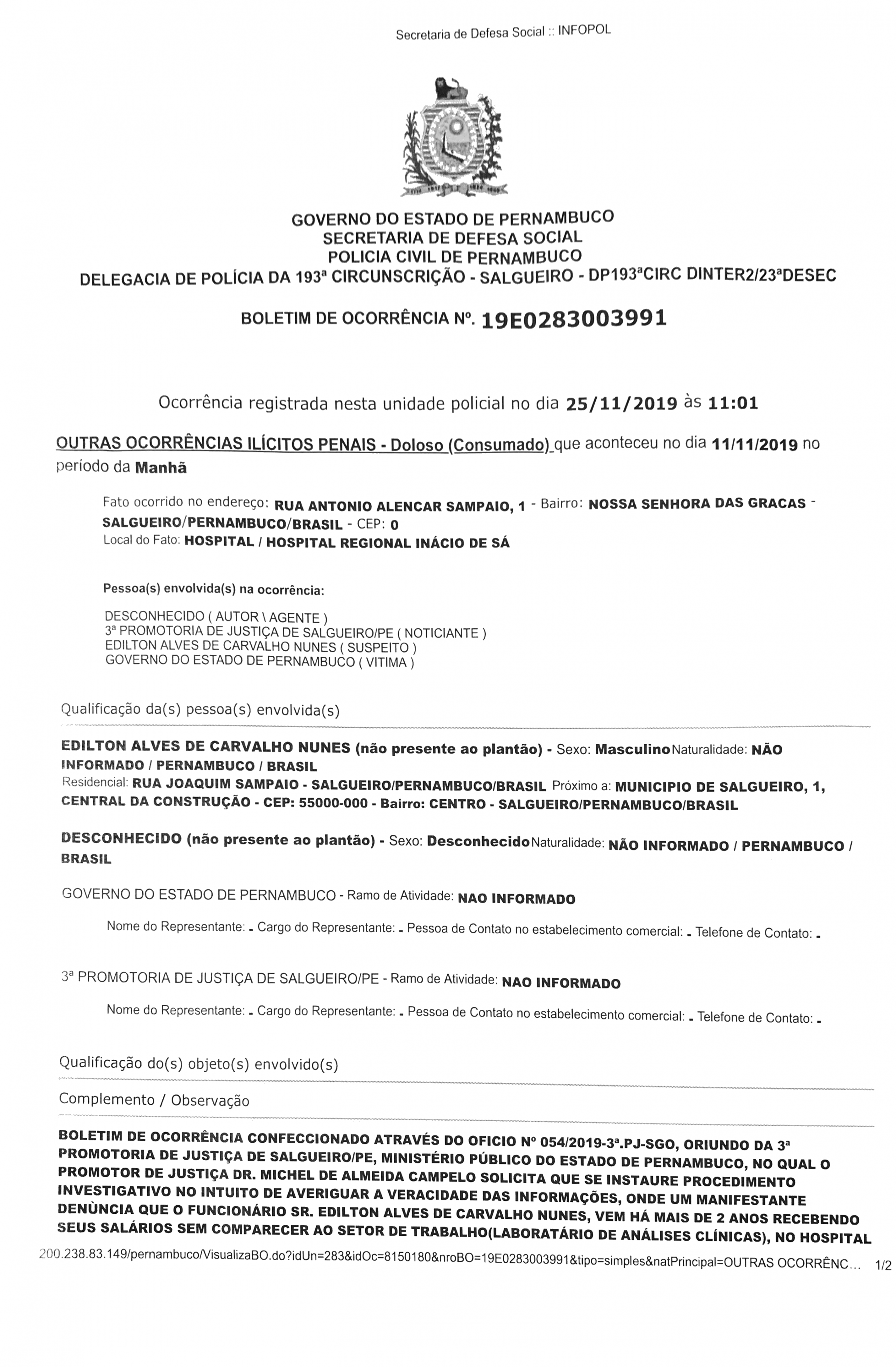 A investigação e o pedido de abertura de inquérito foram solicitados pelo promotor de justiça do Ministério Público Estadual, Michel de Almeida Campelo. Edilton Alves de Carvalho Nunes estava lotado na Secretaria Estadual de Saúde recebendo os salários como funcionário e nunca deu expediente no Hospital Regional. Agora, o processo segue em segredo de justiça.