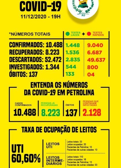 A taxa de ocupação geral dos leitos de UTI da rede pública reduziu de 63,63% nesta quinta para 60,60% nesta sexta. Dos 33 leitos disponíveis, 20 estão ocupados, sendo 10 pacientes de Petrolina e 10 de outras cidades da região. Os dados completos seguem em anexo. Taxa de ocupação de leitos 11.12.2020