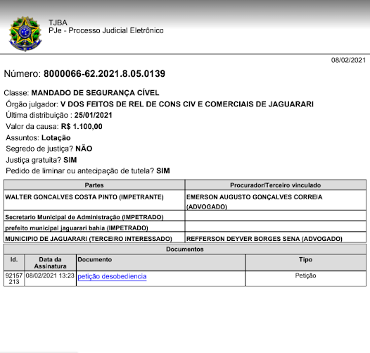 Assim como já havia acontecido, o TJBA indeferiu ao pedido do alcaide e ordenou a reintegração dos servidores afastados de seus cargos sem razoes para tal, o que leva a crer que foram motivadas por perseguição política, haja vista que os servidores não marcharam junto com a turma do PT nas últimas eleições municipais. Mais uma vez o prefeito descumpriu a decisão judicial, desta vez vinda do TJBA. Vale ressaltar que a desobediência de decisão judicial é crime, prevista no Código Penal, sob o Art. 330, que diz que desobedecer a ordem legal de funcionário público: Pena – detenção, de quinze dias a seis meses, e multa.