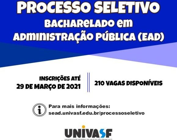 A Universidade Federal do Vale do São Francisco (Univasf), por meio da Secretaria de Educação a Distância (Sead) e da Pró-Reitoria de Ensino (Proen), realiza o processo seletivo 2021.1 para o preenchimento de 210 vagas no curso de Bacharelado em Administração Pública. O curso é ofertado na modalidade a distância, no âmbito do Sistema Universidade Aberta do Brasil (UAB), e está com inscrições abertas até o dia 29 de março.