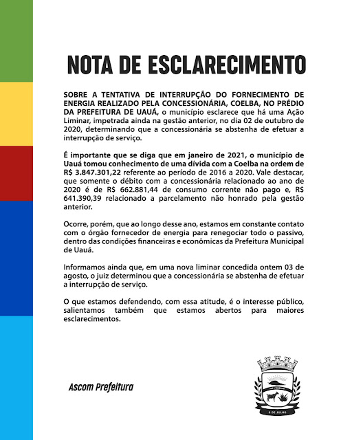 O prefeito do cidade de Uauá, Marcos Lobo (PP), veio a público esclarecer através de nota pública, sobre à ação da Coelba de suspender o fornecimento de energia do prédio da prefeitura municipal, onde Marcos deixou claro que estava tentando negociar dívidas deixados pela administração anterior com a concessionária.