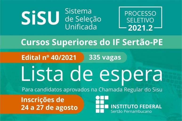 O Instituto Federal do Sertão Pernambucano (IFSertãoPE) publicou, nesta sexta-feira (20), o edital n.º 40/2021, destinado à convocação dos candidatos selecionados para a lista de espera do Sistema de Seleção Unificada (Sisu), com ingresso no segundo semestre de 2021. A ocupação das vagas remanescentes nos cursos de graduação tecnológica, bacharelado e licenciatura oferecidos pela instituição utilizará como referência a lista de espera do Sisu 2021.2, obedecendo, ainda, às cotas instituídas por lei.