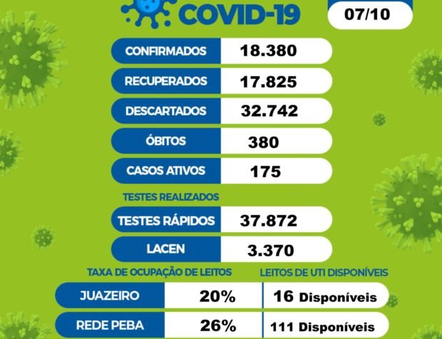 De acordo com o levantamento, 18.380 moradores foram infectados desde o início da pandemia na cidade, dos quais 17.825 já estão recuperados. Os casos descartados somam 32.742. Juazeiro tem 175 casos ativos do novo coronavírus.