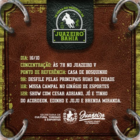 A Prefeitura de Juazeiro, através da Secretaria de Cultura, Turismo e Esportes (Seculte), vai promover, neste sábado (16), a partir das 7h, a IX Festa do Vaqueiro do município. O evento, que tem como objetivo reverenciar uma das figuras mais importantes da cultura nordestina, contará com cavalgada, missa e show musical, seguindo todos os protocolos sanitários e medidas recomendadas pelos órgãos de saúde municipal, estadual e federal.