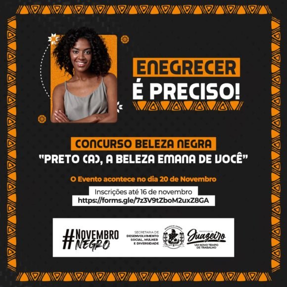 O Concurso Beleza Negra – ‘Preto (a), a beleza emana de você’ visa escolher a mais bela negra e o mais belo negro de Juazeiro, que representará a cidade no Concurso Beleza Negra da Bahia. As candidatas e candidatos podem se inscrever através do endereço eletrônico https://forms.gle/7z3V9tZboM2uxZ8GA, até o dia 16 de novembro.