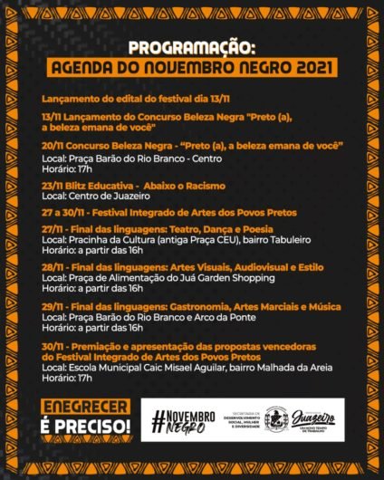 Acontece neste sábado (20), a partir das 17h, na Praça Barão do Rio Branco, no centro de Juazeiro, o concurso ‘Beleza Negra – ‘Preto (a), a beleza emana de você’. O evento, que integra a programação do Novembro Negro, é uma ação da Prefeitura de Juazeiro, através da Secretaria de Desenvolvimento Social, Mulher e Diversidade (Sedes), e visa escolher a mais bela negra e o mais belo negro de Juazeiro.