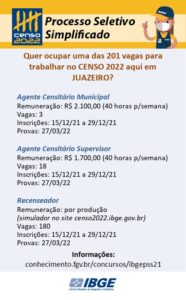 A Prefeitura de Juazeiro informa à população que o Instituto de Geografia e Estatística (IBGE), parceiro da gestão municipal, está com inscrições abertas para o processo seletivo simplificado para o Censo 2022, para os cargos de Agente Censitário (Municipal e Supervisor) e Recenseador.