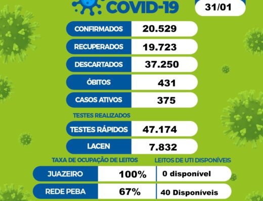 O município confirmou 23 novos casos da doença. De acordo com o levantamento, 20.529 moradores foram infectados desde o início da pandemia na cidade, dos quais 19.723 já estão recuperados. Os casos descartados somam 37.250. Juazeiro tem 375 casos ativos do novo coronavírus.