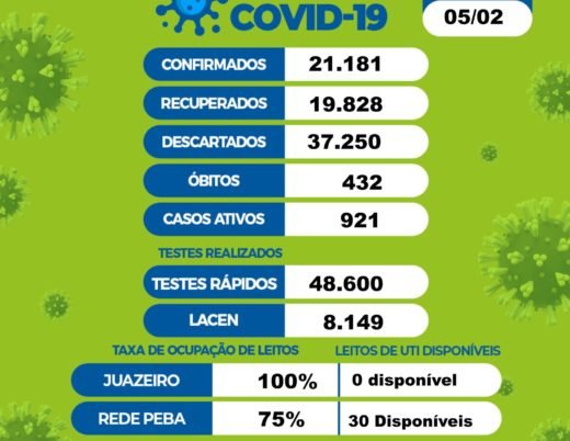 Foram confirmados 23 novos casos. De acordo com o levantamento, 21.181 moradores foram infectados desde o início da pandemia na cidade, dos quais 19.828 já estão recuperados. Os casos descartados somam 37.250. Juazeiro tem 921 casos ativos do novo coronavírus.