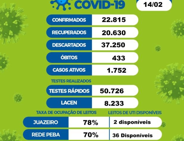 Na rede hospitalar, o percentual de ocupação dos leitos de UTI para Juazeiro na rede PEBA (hospitais de Pernambuco e Bahia) é de 70%, com 36 leitos disponíveis. Somente em Juazeiro, 78% dos leitos de UTI para pacientes com Covid-19 estão ocupados, com 2 leitos disponíveis.