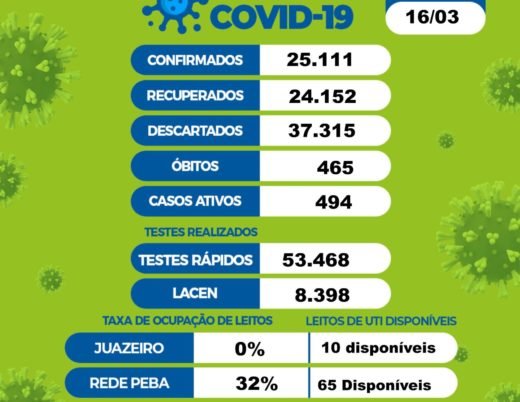Na rede hospitalar, o percentual de ocupação dos leitos de UTI para Juazeiro na rede PEBA (hospitais de Pernambuco e Bahia) é de 32%, com 65 leitos disponíveis. Somente em Juazeiro, 0% dos leitos de UTI para pacientes com Covid-19 estão ocupados, com 10 leitos disponíveis.