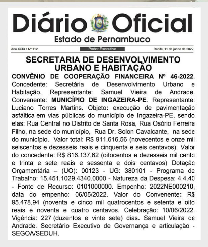 Nas redes sociais, o prefeito Luciano Torres comemorou a publicação do convênio no Diário Oficial. “Foi publicado no Diário Oficial de hoje, 11 de junho de 2022, o convênio entre o município de Ingazeira e o Estado de Pernambuco, para a execução de pavimentação asfáltica na Sede e no Distrito de Santa Rosa, assim, continuaremos o projeto de melhoria contínua de nossa cidade. Agradecemos ao Governador Paulo Câmara a atenção com nosso município. Continuaremos na luta, porque o nosso compromisso é com o povo”.