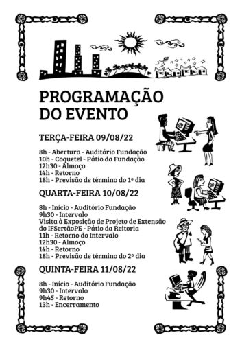 Em anexo, segue abaixo a programação do evento, que contará com uma Mostra de Projetos de Extensão no dia 10 de agosto, das 9h às 12h e das 13h às 17h, aberta ao público em geral, com visita de escolas públicas municipais e estaduais. A Mostra ocorrerá no Hall de Entrada da Reitoria do IFSertãoPE, localizada na rua Aristarco Lopes, Centro, em frente à Igreja Matriz de Petrolina.
