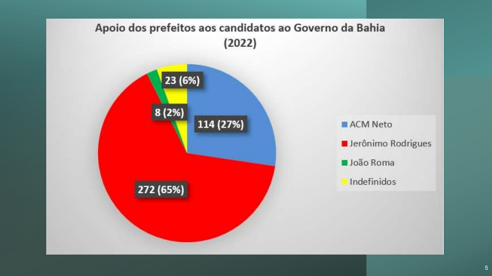 Os dois primeiros colocados nas pesquisas de intenções de voto, ACM Neto (UB) e Jerônimo Rodrigues (PT), concentram quase a totalidade dos apoios. O ex-prefeito de Salvador tem até o momento o apoio declarado de 114 prefeitos, que representa 27% do total.