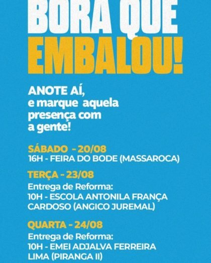 A prefeitura de Juazeiro estará realizando a inauguração das reformas das Escolas Municipais: Antonila da França Cardoso, localizada na comunidade de Angico, no distrito Juremal, na terça-feira (23), a partir das 10h; e da EMEI Adjalva Ferreira Lima, localizada em Piranga II, na quarta-feira (24), também a partir das 10h.
