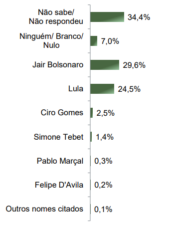 Na metodologia espontânea – onde os entrevistados podem indicar livremente seus políticos – os números mudam. E o quantitativo de indecisos atinge um patamar superior aos que indicam votar no candidato à reeleição, Jair Bolsonaro (PL), que tem 29,6%, e aos que preferem o ex-presidente Lula (PT), que surge em seguida com 24,5%.