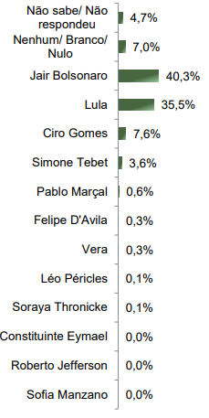 De acordo com a pesquisa de intenção de votos estimulada, aparecem logo após os primeiros dois colocados o paulista radicado no Ceará, Ciro Gomes (PDT), com 7,6%, e a senadora Simone Tebet (MDB), que figura com 3,6%.