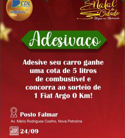 A Campanha Natal da Cidade realizou neste sábado (24), o tradicional Adesivaço, promovido pela Câmara de Dirigentes Lojistas de Petrolina (CDL) e o Sindicato do Comércio Varejista (SINDILOJAS), com patrocínio da Wantel e parceria do Posto Falmar.