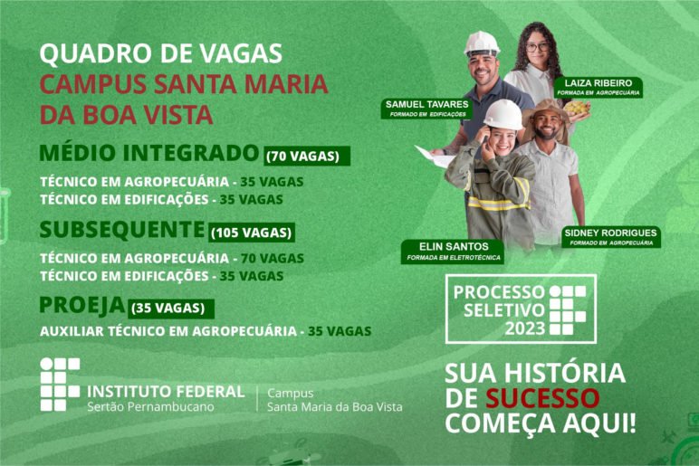 Até o dia 24 de outubro, estão abertas as inscrições para o Processo Seletivo (PS) 2023 do Instituto Federal do Sertão Pernambucano (IFSertãoPE). Para o campus Santa Maria da Boa Vista, estão disponíveis 210 vagas, distribuídas da seguinte forma: 70 vagas para a modalidade Técnico Integrado ao Ensino Médio, 105 para a modalidade Técnico Subsequente e mais 35 para a modalidade Educação de Jovens e Adultos (Proeja). Para concorrer a uma das vagas disponíveis, os candidatos necessitam cadastrar-se previamente na plataforma Gov.br (saiba mais aqui) e, em seguida, utilizar as mesmas credenciais de acesso no Portal do Aluno.