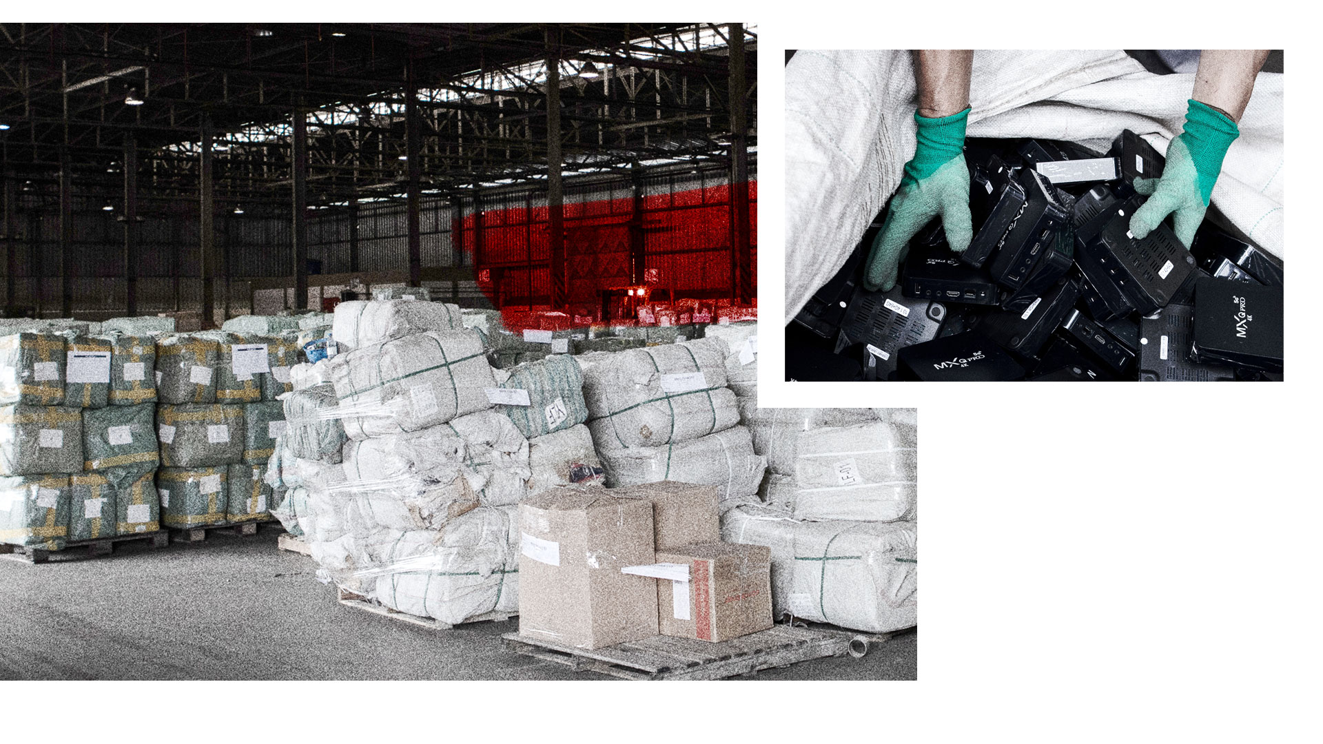 Em uma área do porto, sacos brancos de lona armazenam restos de peças de plástico preto, onde se lê expressões como “5G” e “4K”. São aparelhos de TV Box.