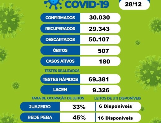 Na rede hospitalar, o percentual de ocupação dos leitos de UTI para Juazeiro na rede PEBA (hospitais de Pernambuco e Bahia) é de 45%, com 16 leitos disponíveis. Somente em Juazeiro, 33% dos leitos de UTI para pacientes com Covid-19 estão ocupados, com 06 leitos disponíveis.